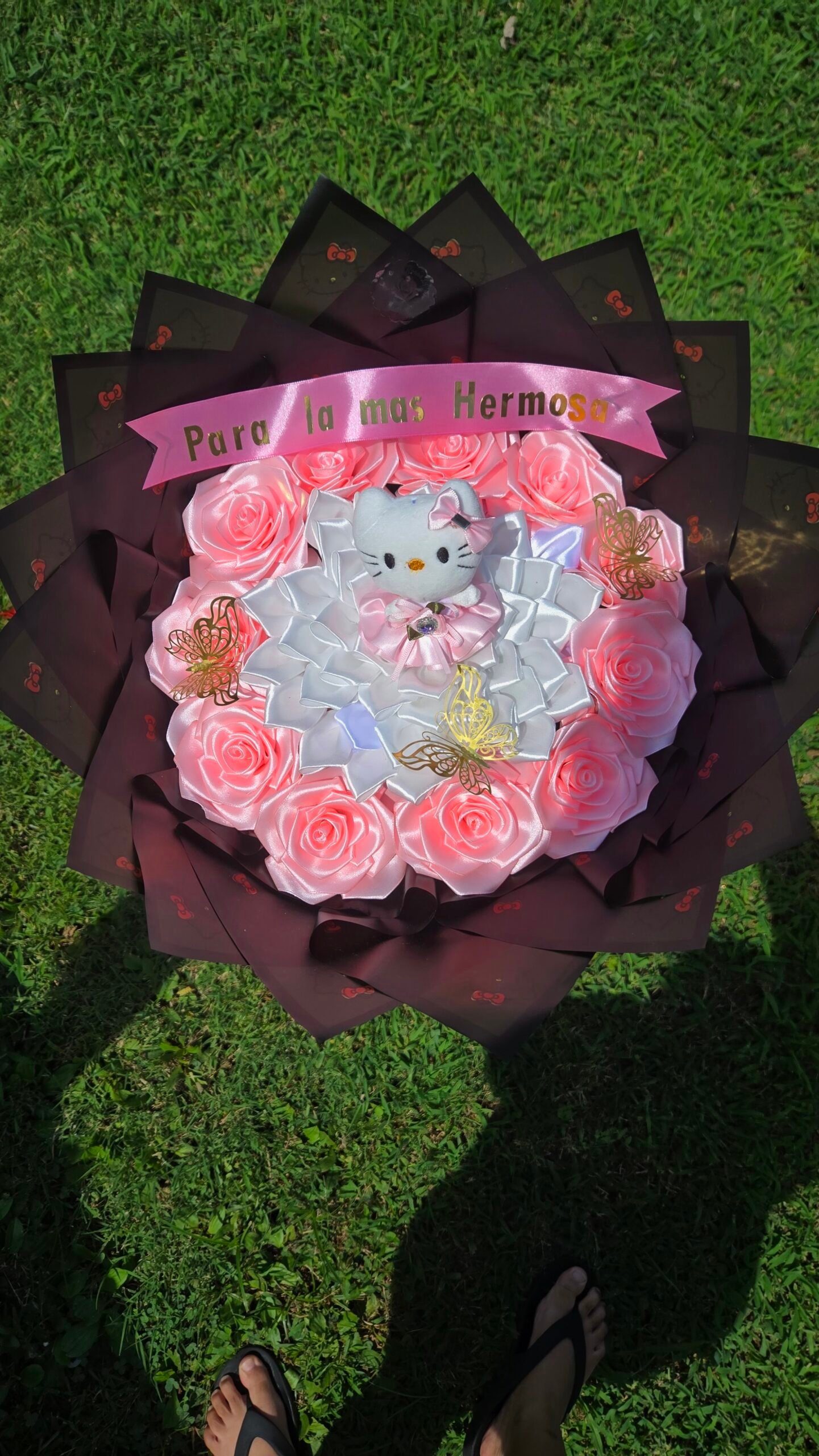 12 rosas de liston, y una Dalia grande con un peluche de hello kittie.. tambien tenemos otros peluches disponibles